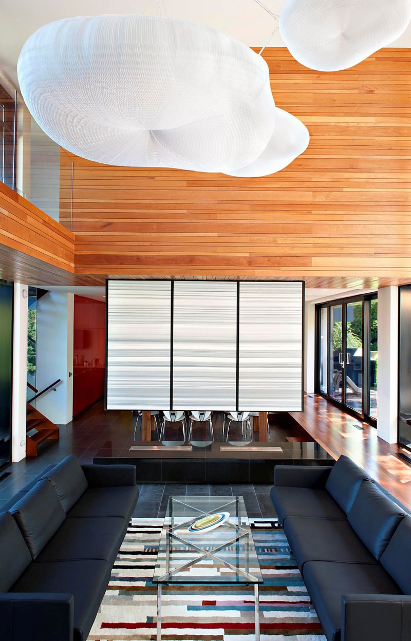 “This new modern residence accommodates a family of 6 and their guests. Private spaces are arranged to allow for an open concept space with double height living room surrounded by a catwalk.